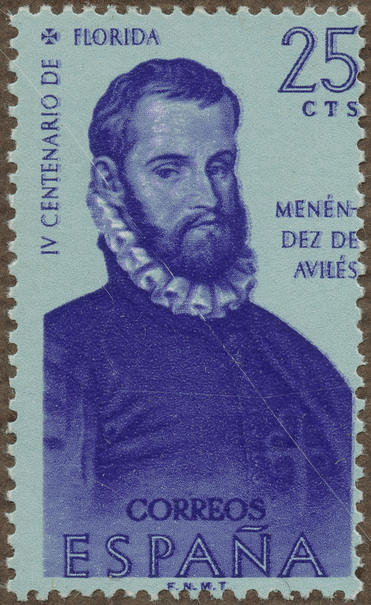 Frimärke från Spanien, 1962. Motiv av Menéndez de Avilès 1519-1574 Spansk sjöfarare Grundlade St. Augustine Florida -Till 400-årsminne av Florida-