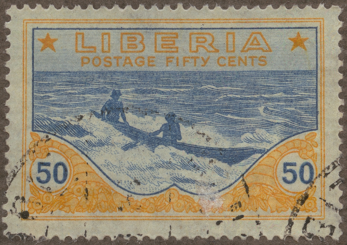 Frimärke från Afrika: Liberia, 1921. Motiv av "Pirog" i bränningar.