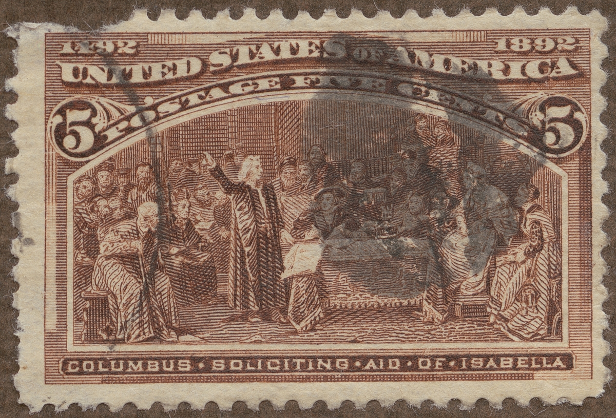 Frimärke från U.S.A., 1893. Motiv av Columbus begär hjälp av Drottning Isabella av Spanien för sin resa. "-Columbus serie, 16v.-"