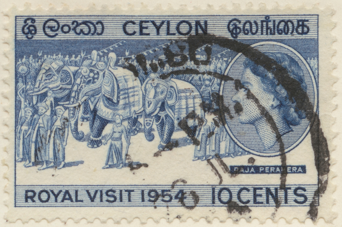 Frimärke från Ceylon, 1954. Motiv av Elefantparad vid Kungabesök (t.h.) Drottning Elizabeth II- -Minne av Drottning Elizabeth II och Hertigen av Edinburghs besök på Ceylon: 1954-