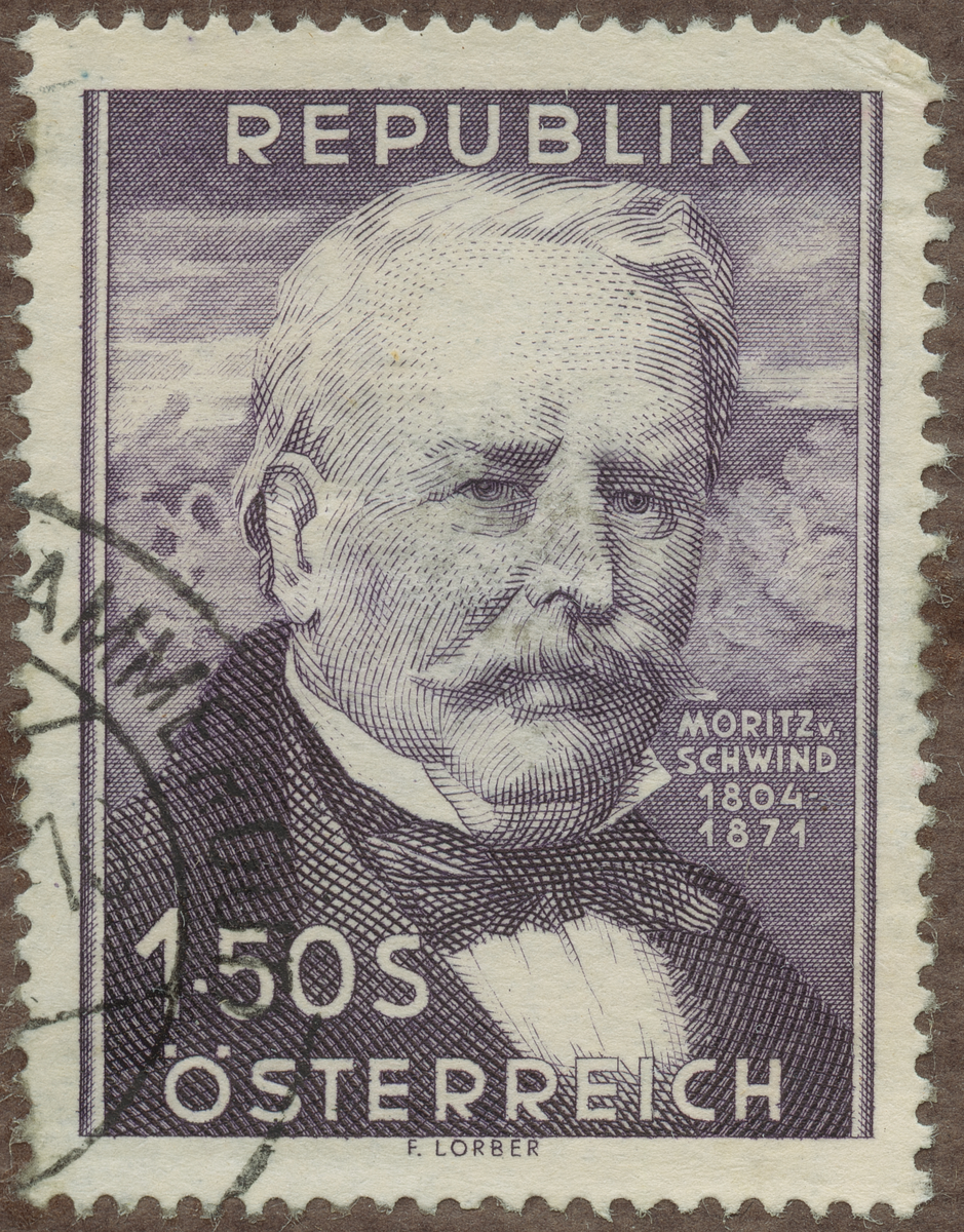 Frimärke från Österrike, 1954. Motiv av Moritz von Schwind 1804-1871. Konstnär Målare Prof. i München 150-årsminne 1804-1954.