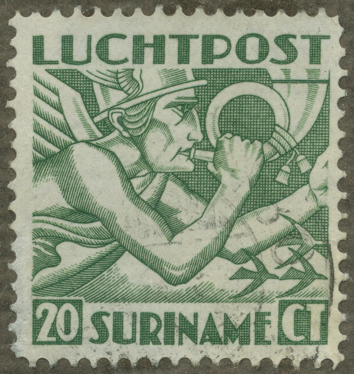 Frimärke från Surinam, 1920. Motiv av Flygande Merkurius med posthorn Symbol för flygpost