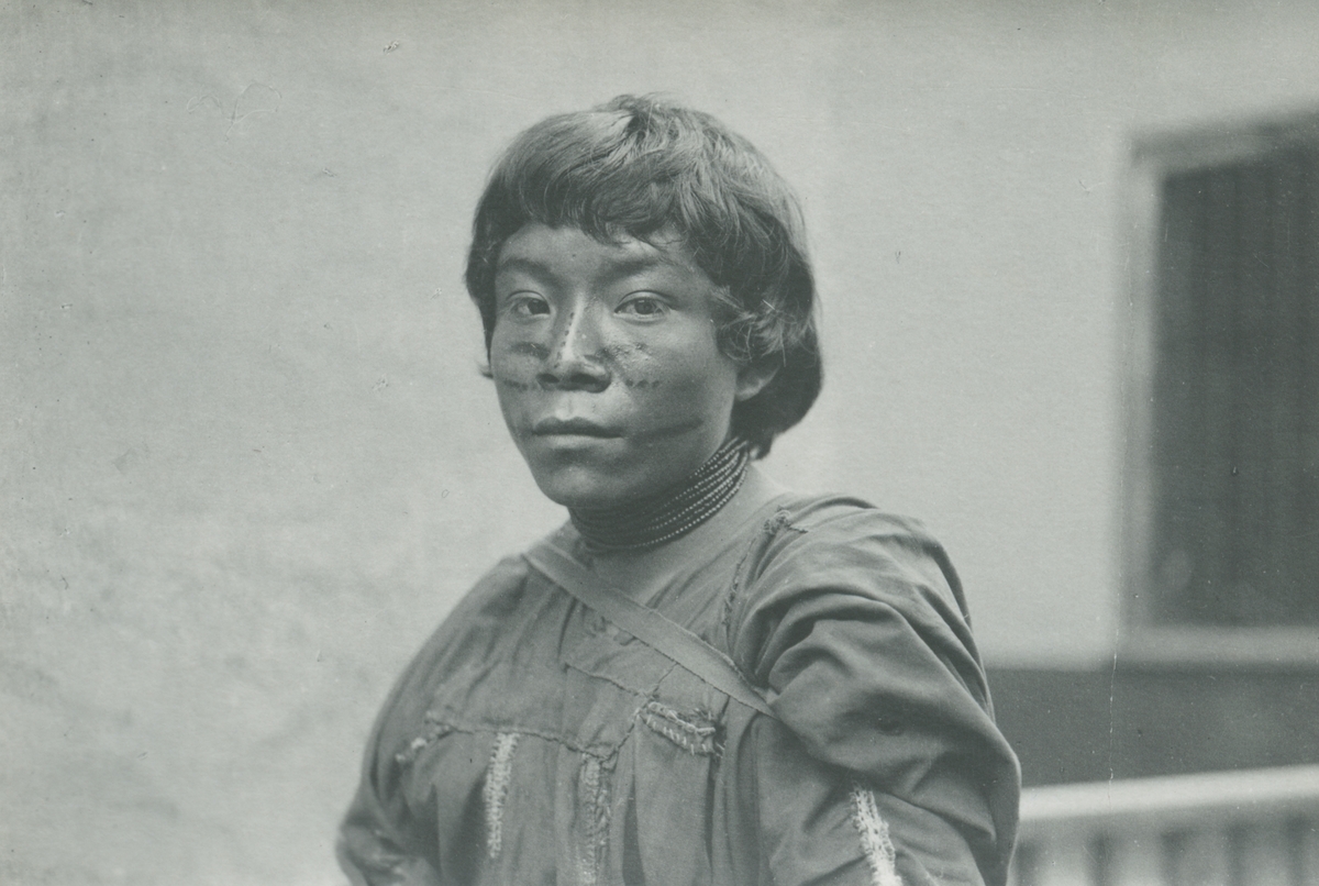 Fotografi från expedition till Peru 1920. Porträtt av ung man med ansiktsmålning.