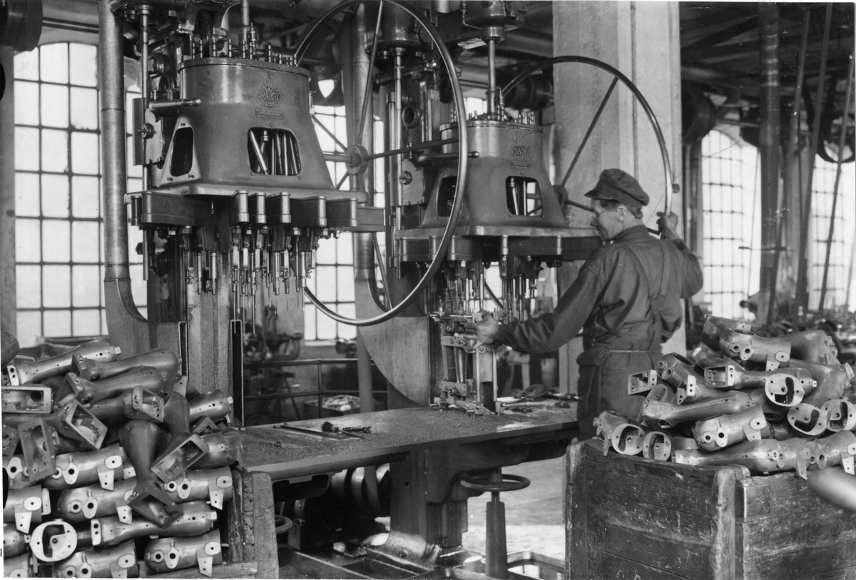 Husqvarna Vapenfabriks AB. Borrning av symaskinsarm i flerspindlig borrmaskin.