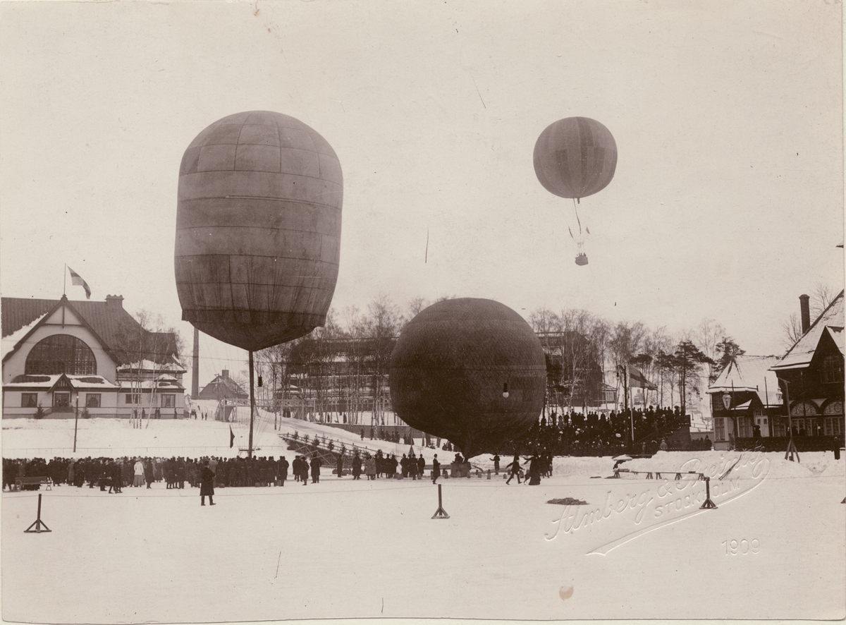 Till vänster "S.A. Andrée" (kulballong utan nät 1500 kbm) tillhörande Kungliga Svenska Aeronautiska Sällskapet. I mitten "Svenske 2" (system Unge 100 kbm) tillhörande Greve Hamilton och Löjtnant Fogman. Till höger "Argonant" (kulballong med nät 1000 kbm) tillhörande Direktör C. Smitt.