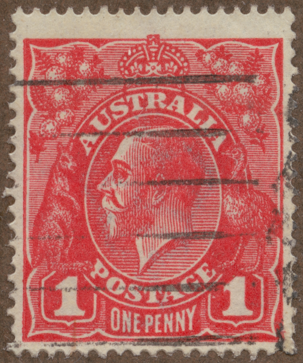 Frimärke från Australien, 1914. Motiv av Känguru t.v.