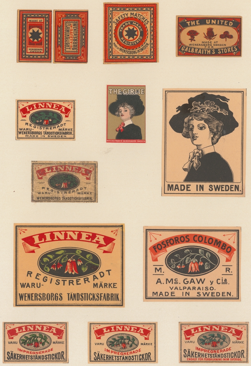 Etiketter för tändsticksaskar, från Svenskt Industri- och Handelsmuseum.