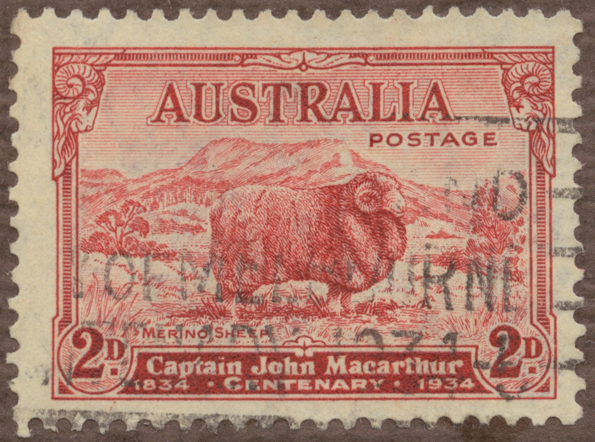 Frimärke från Australien, 1934. Motiv av Bagge av Merinoras Capt. John Macarthur: 1767-1834: Grundlade New South Wales´ ullindustri 100-årsminne av hans död. 1834-1934