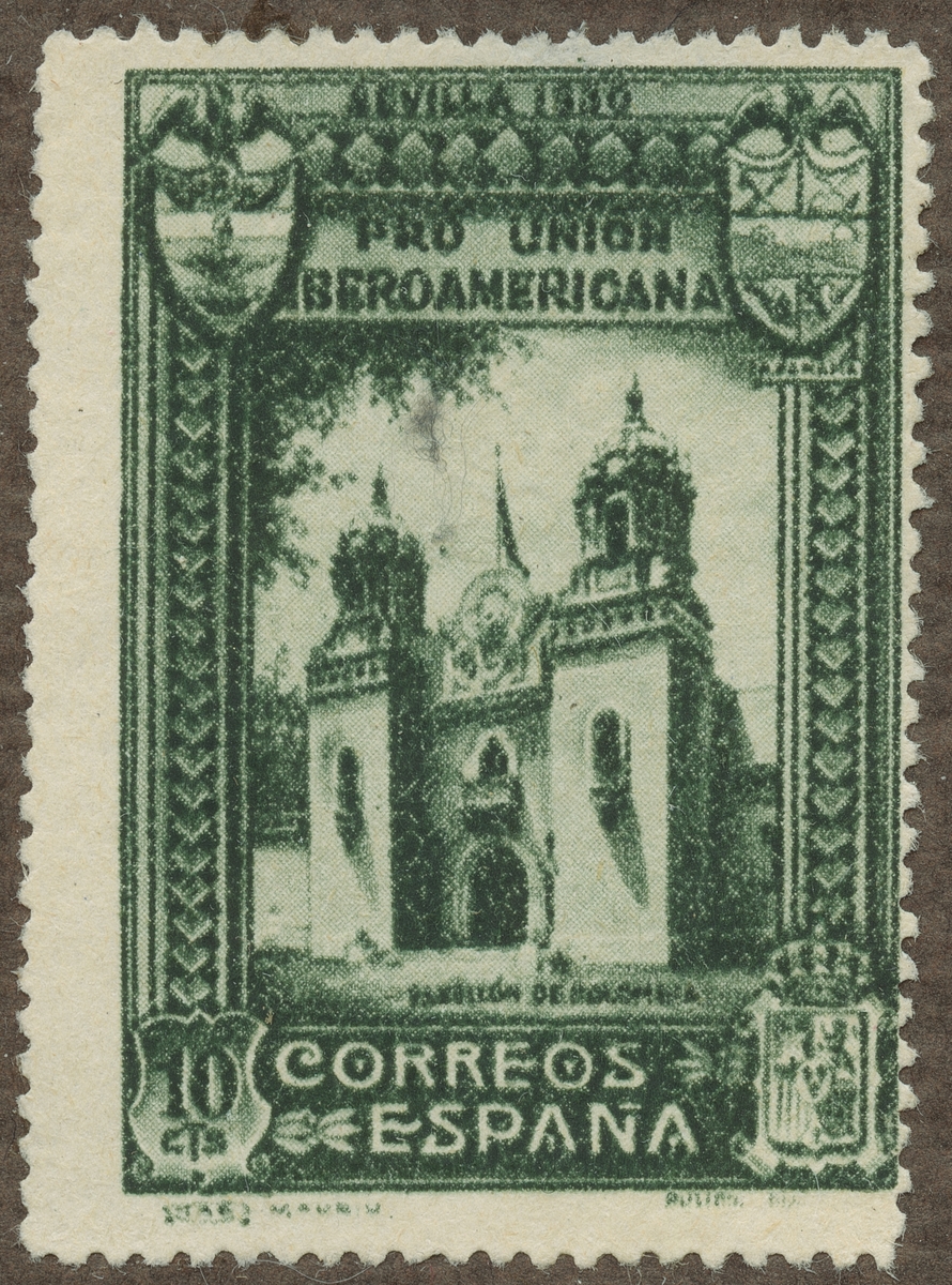 Frimärke från Spanien, 1930. Motiv av Colombias Paviljong Utställningen i Sevilla 1930.