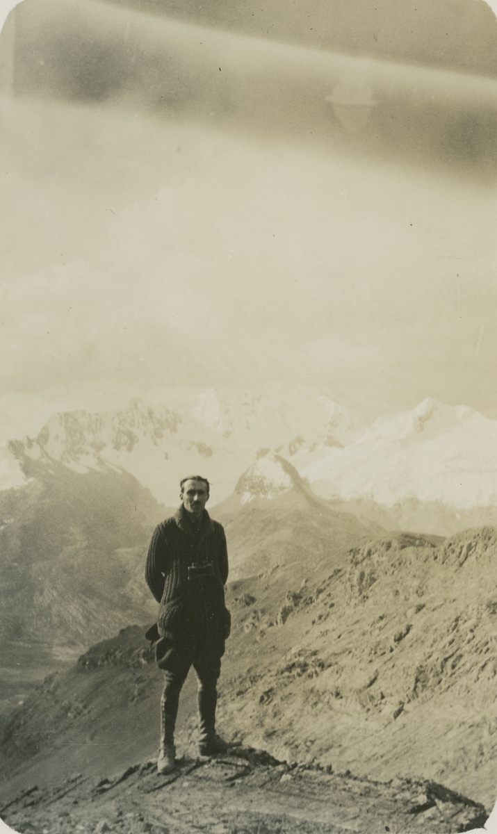 Fotografi från expedition till Peru 1920. Motiv av man som poserar framför ett delvis snötäckt bergslandskap. Mannen på bilden är möjligtvis kartografen Nils Pallin.