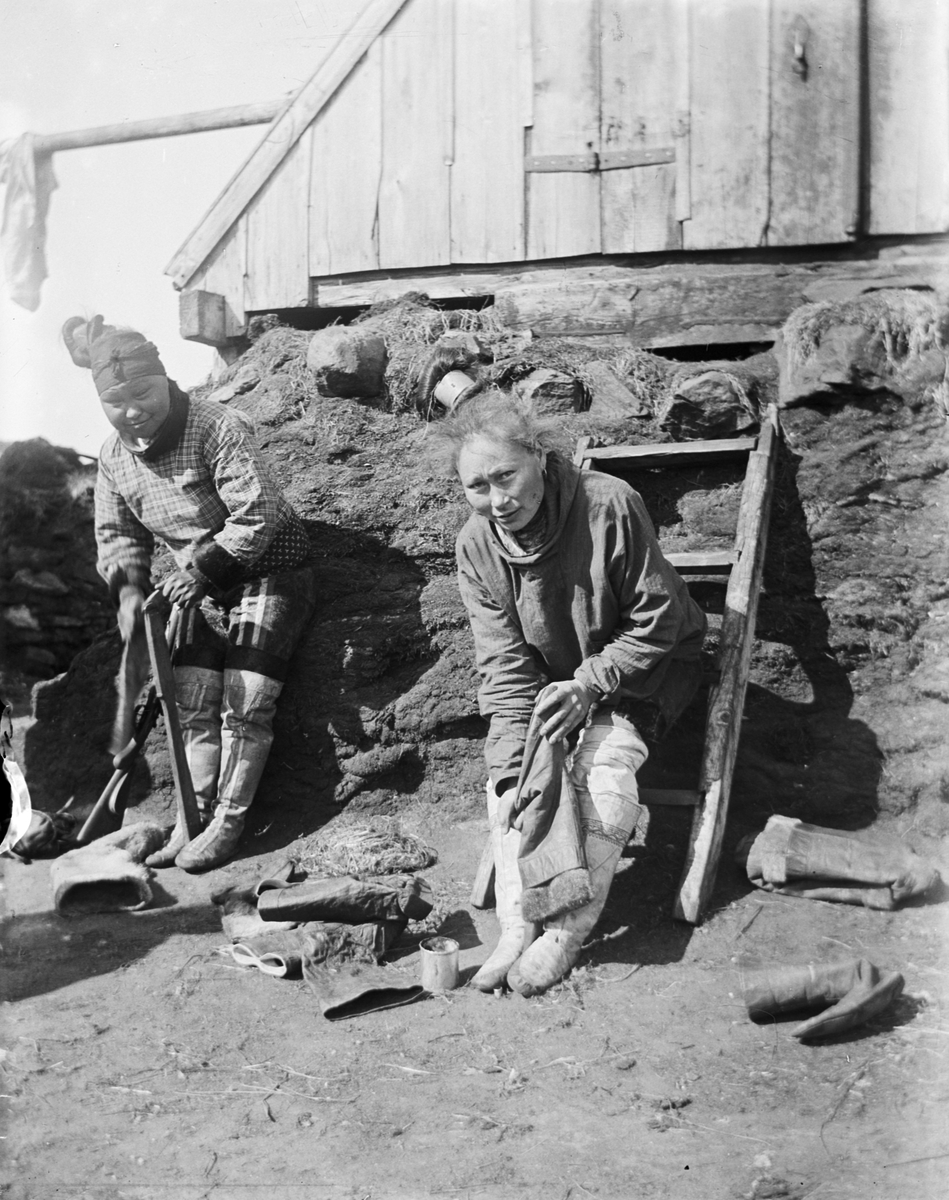 Fotografi från Grönland. Motiv av två kvinnor som arbetar framför hydda.