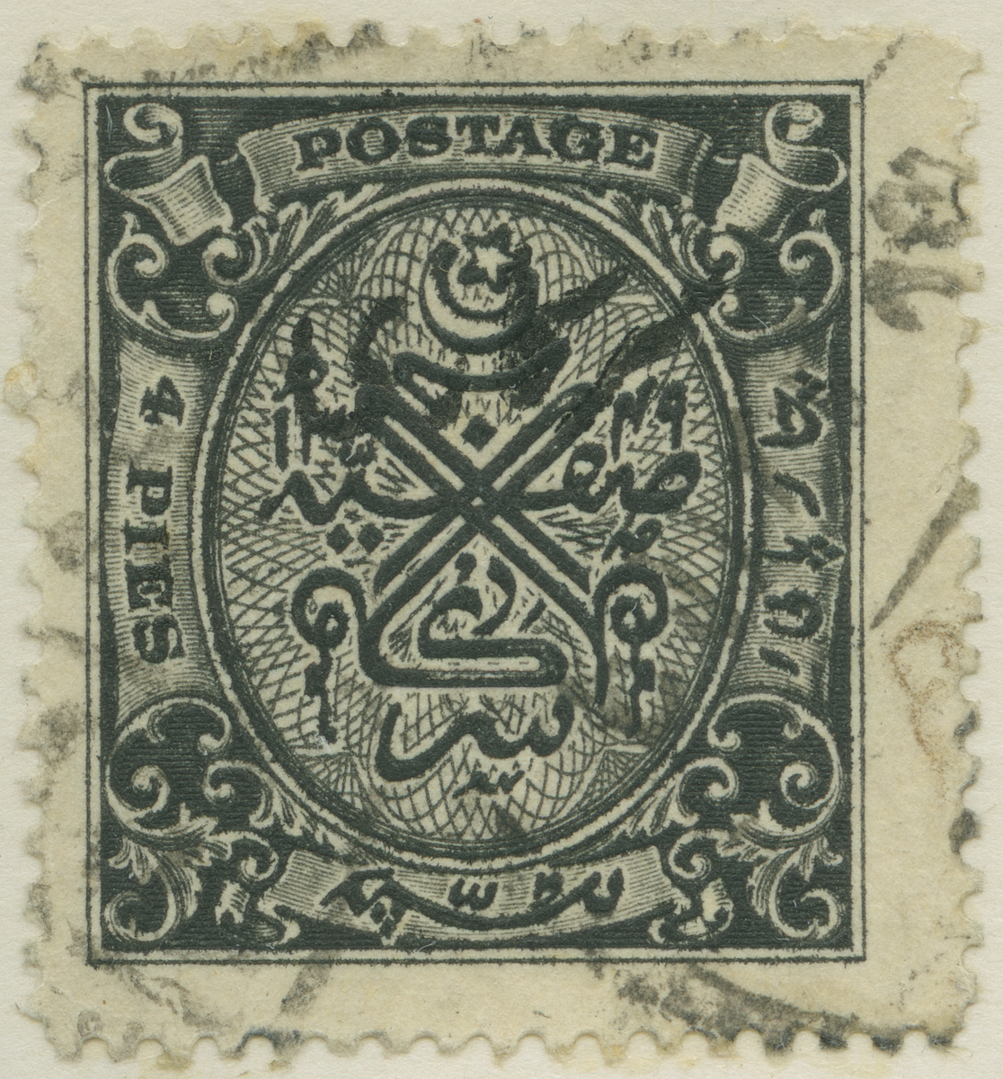 Frimärke från Hayderabad, 1931. Motiv av Nizamens monogram i indisk skrift