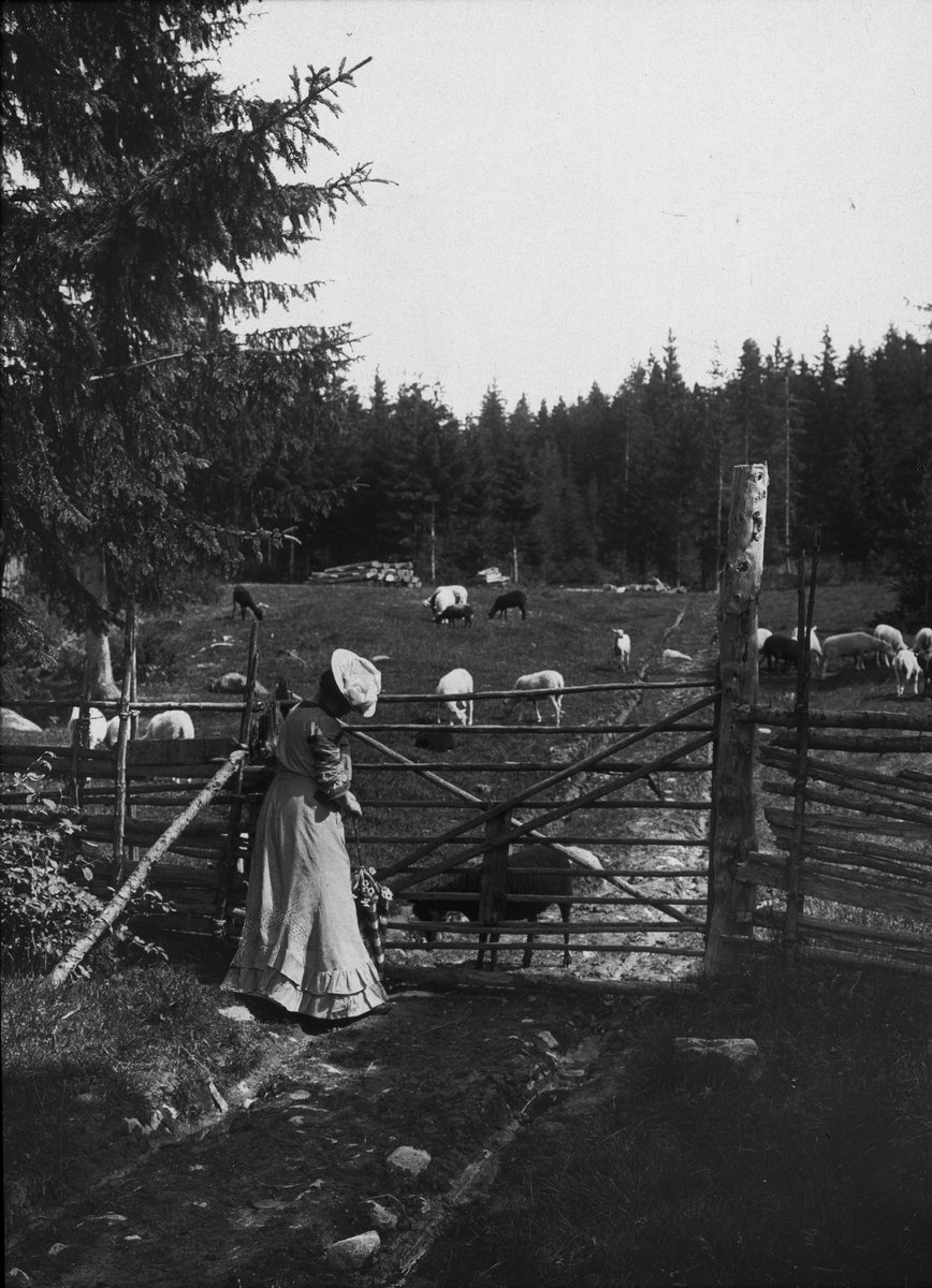 Diapositiv, fönster-bild med motiv av kvinna i hatt vid gring till fårhage.