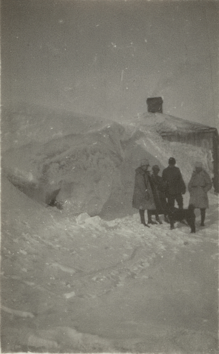 Fotografi från expedition till Spetsbergen. Motiv av fyra människor och en hund som står framför ett snötäckt hus.
