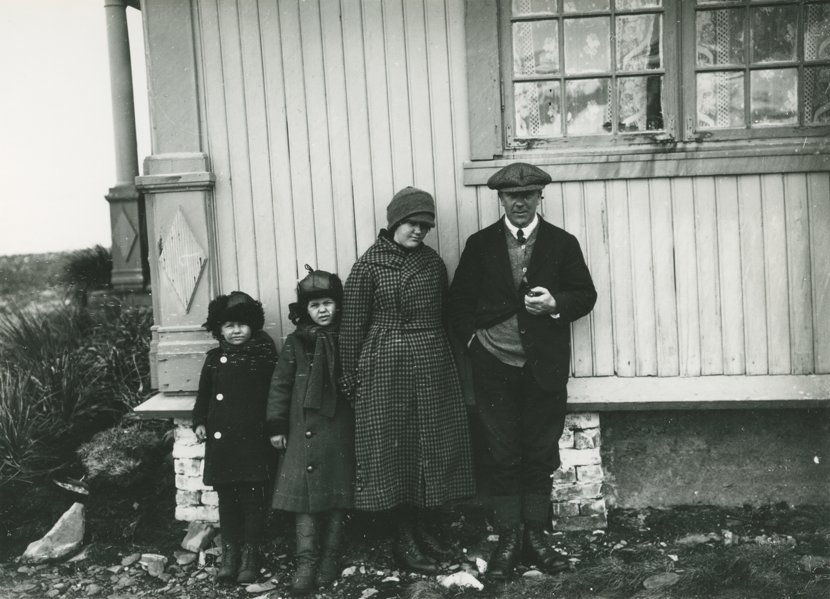 Bild från expedition i Antarktisområdet. Motiv av familj utanför hus i King Edward's Point.