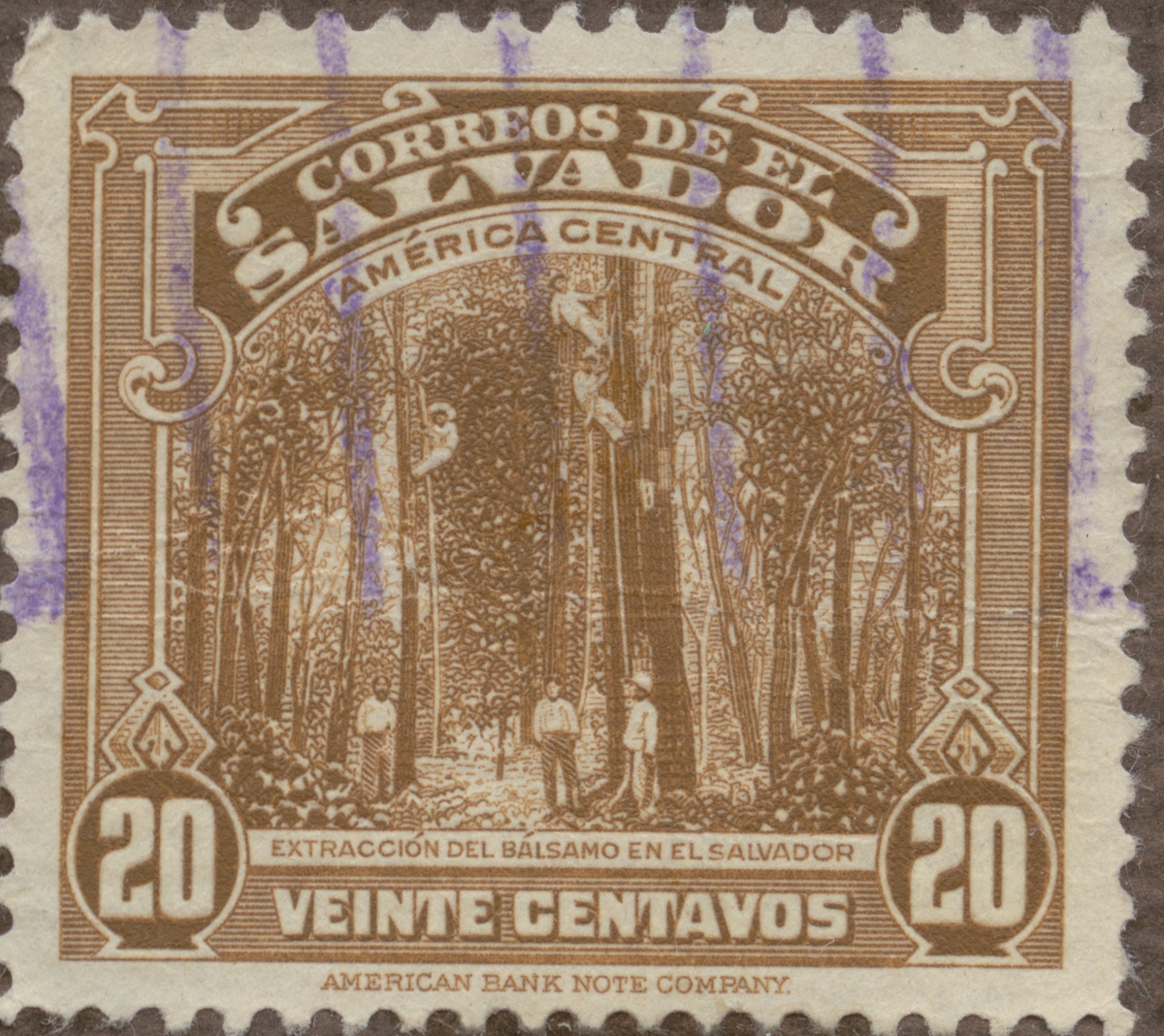 Frimärke från Salvador, 1938. Motiv av skogsbruk i Salvador, balsam extraktion.