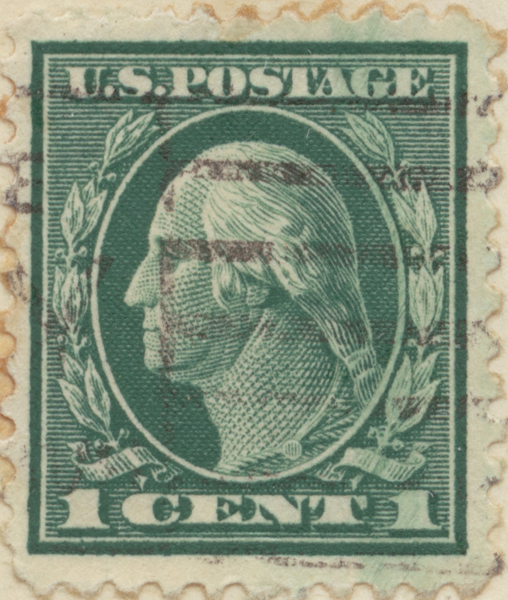 Frimärke från USA, 1912. Motiv av lagerkvistar och George Washington, efter byst av Fransmannen Jean Houdon, 1741-1828.