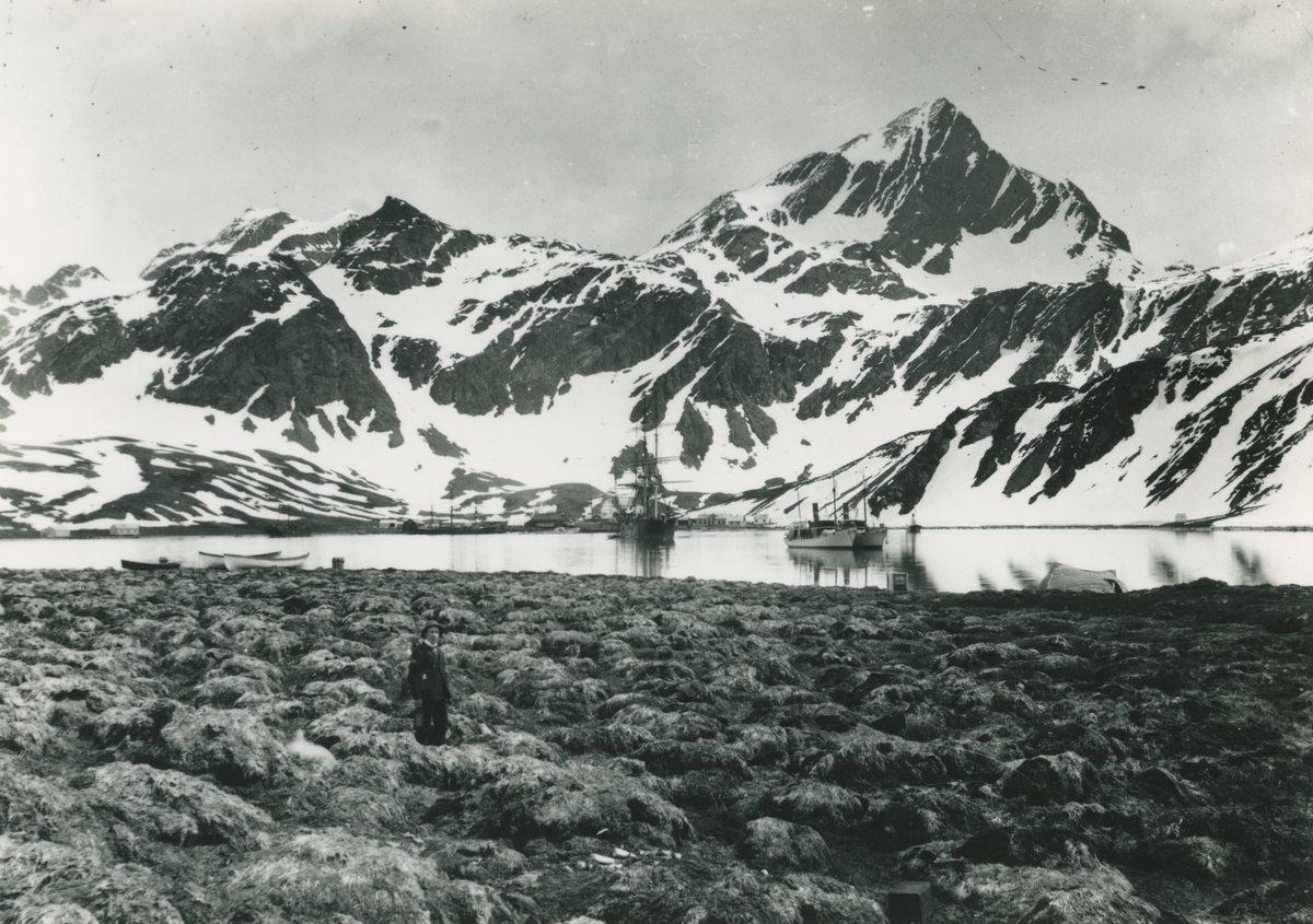 Bild från expedition i Antarktisområdet. Vy över snötäckta berg med båtar och vatten i förgrunden.