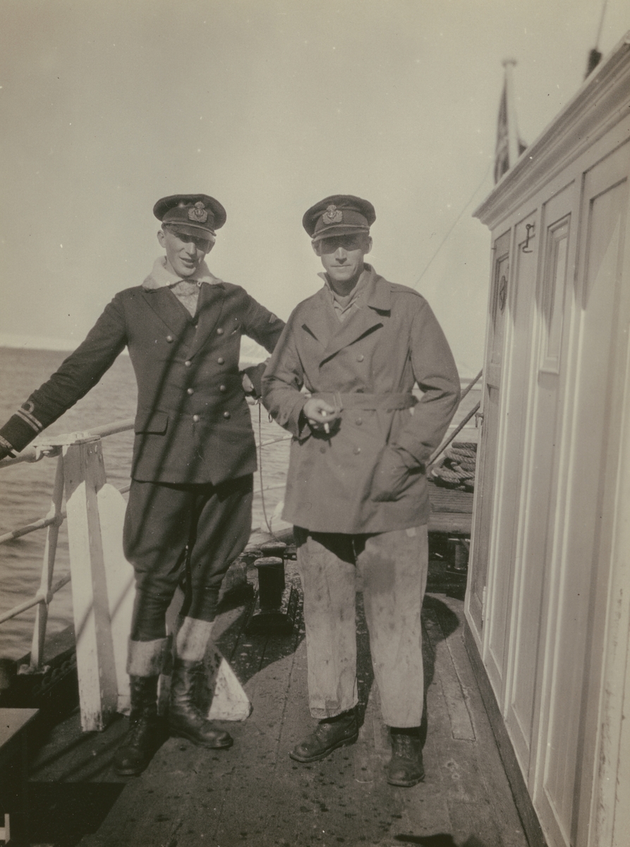 Fotografi från svenska undsättningsexpeditionen 1928. Motiv av två män ombord på båt.