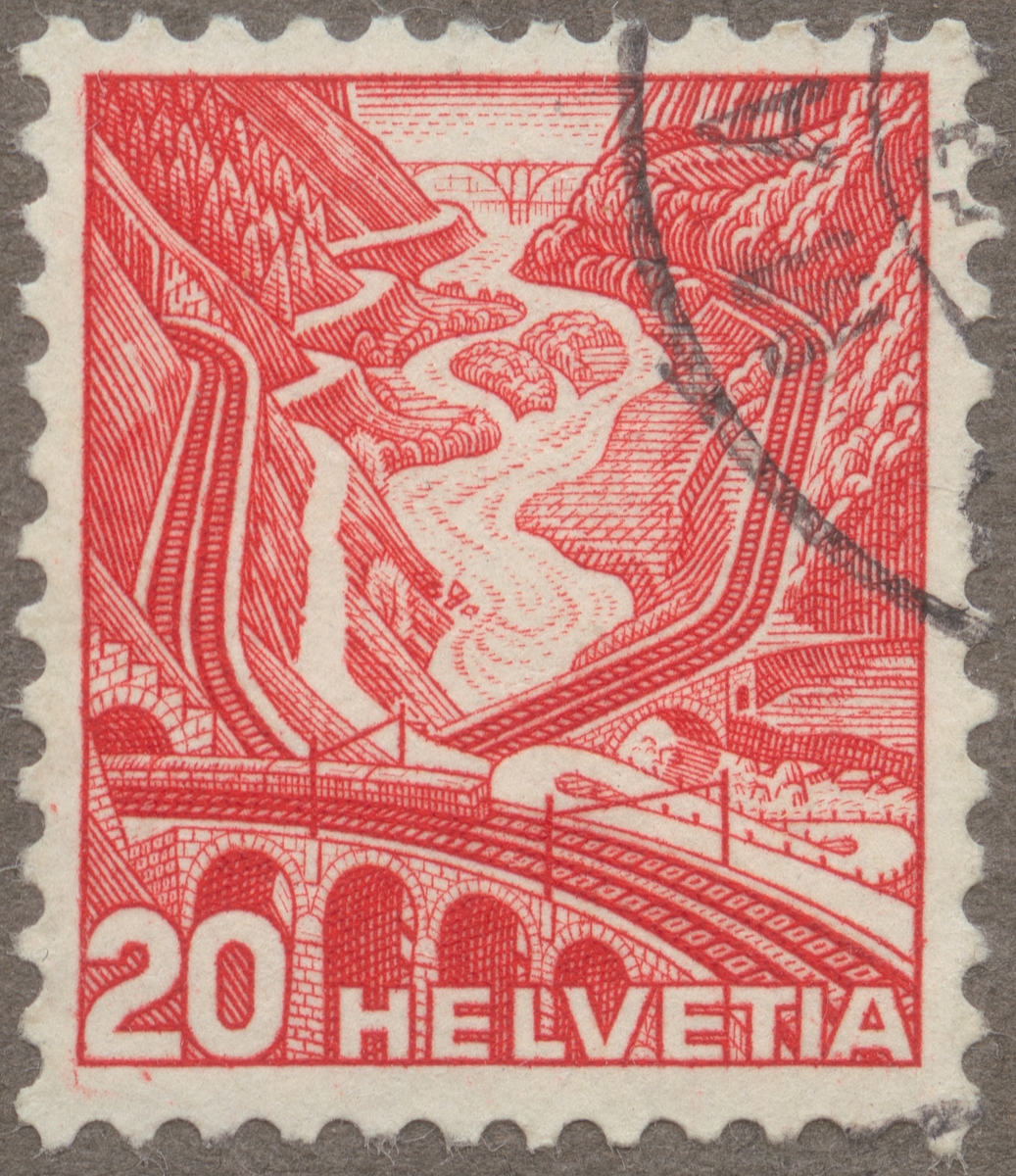 Frimärken ur Gösta Bodmans filatelistiska motivsamling, påbörjad 1950. Frimärke från Schweiz, 1934. Motiv av S:t Gotthardsbanan "S:t Gotthardsbanan byggdes åren 1872- 1882. Märket återger sträckan Lavorgo-Giornico. Banan har 80 tunnlar."