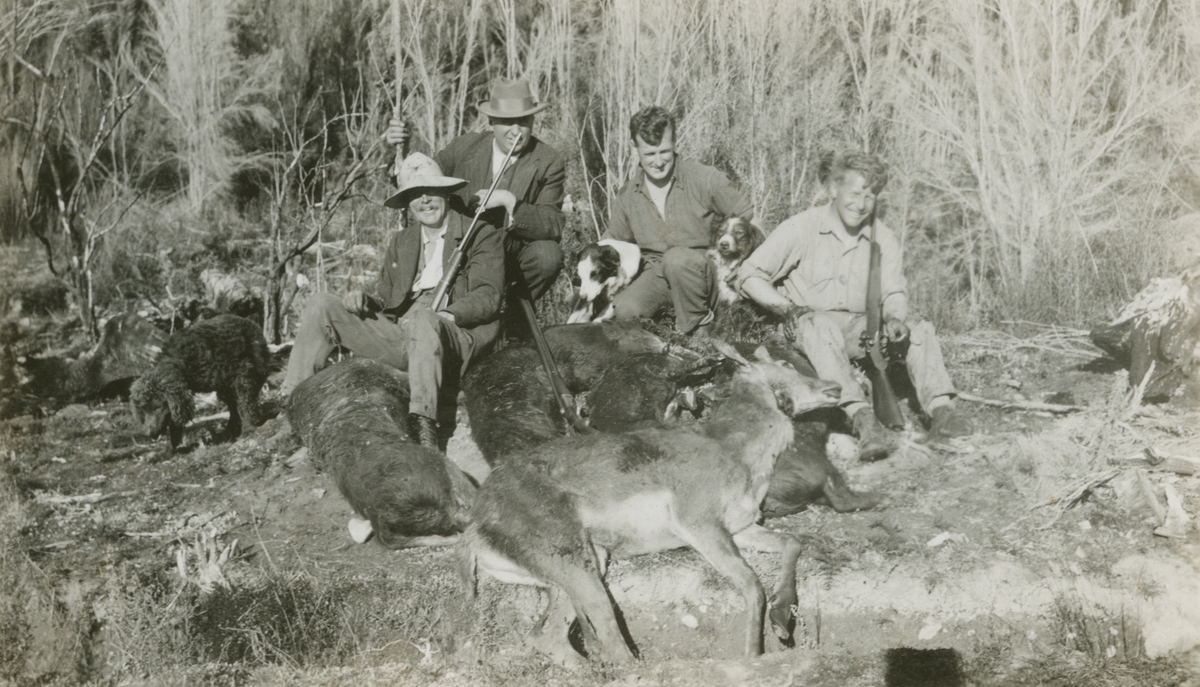 Fotografi från låda märkt Bernt Balchen. Balchen var norsk-amerikansk flygare, polarforskare och militär. Motiv av Balchen och tre andra män med gevär som sitter vid ett antal döda hjortar. Balchen sitter längst till höger.
