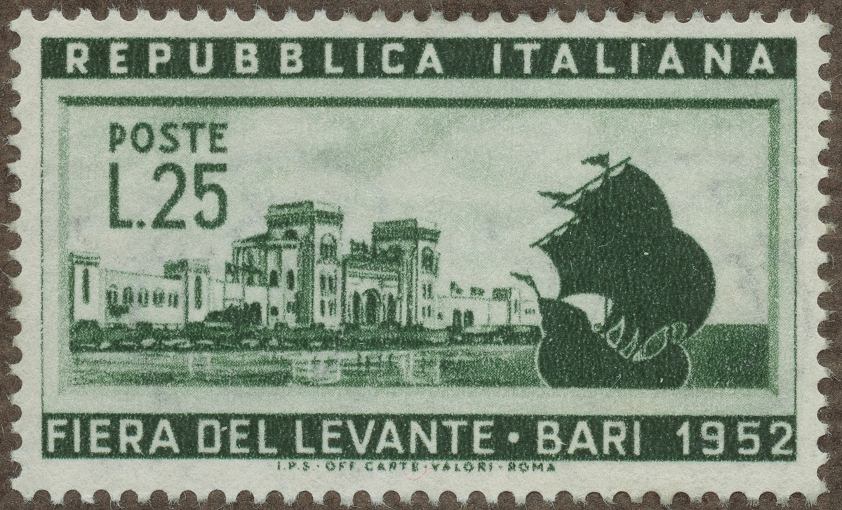 Frimärke från Italien, 1952. Motiv av Utställningsbyggnad Levantiska mässan i Bari 1952