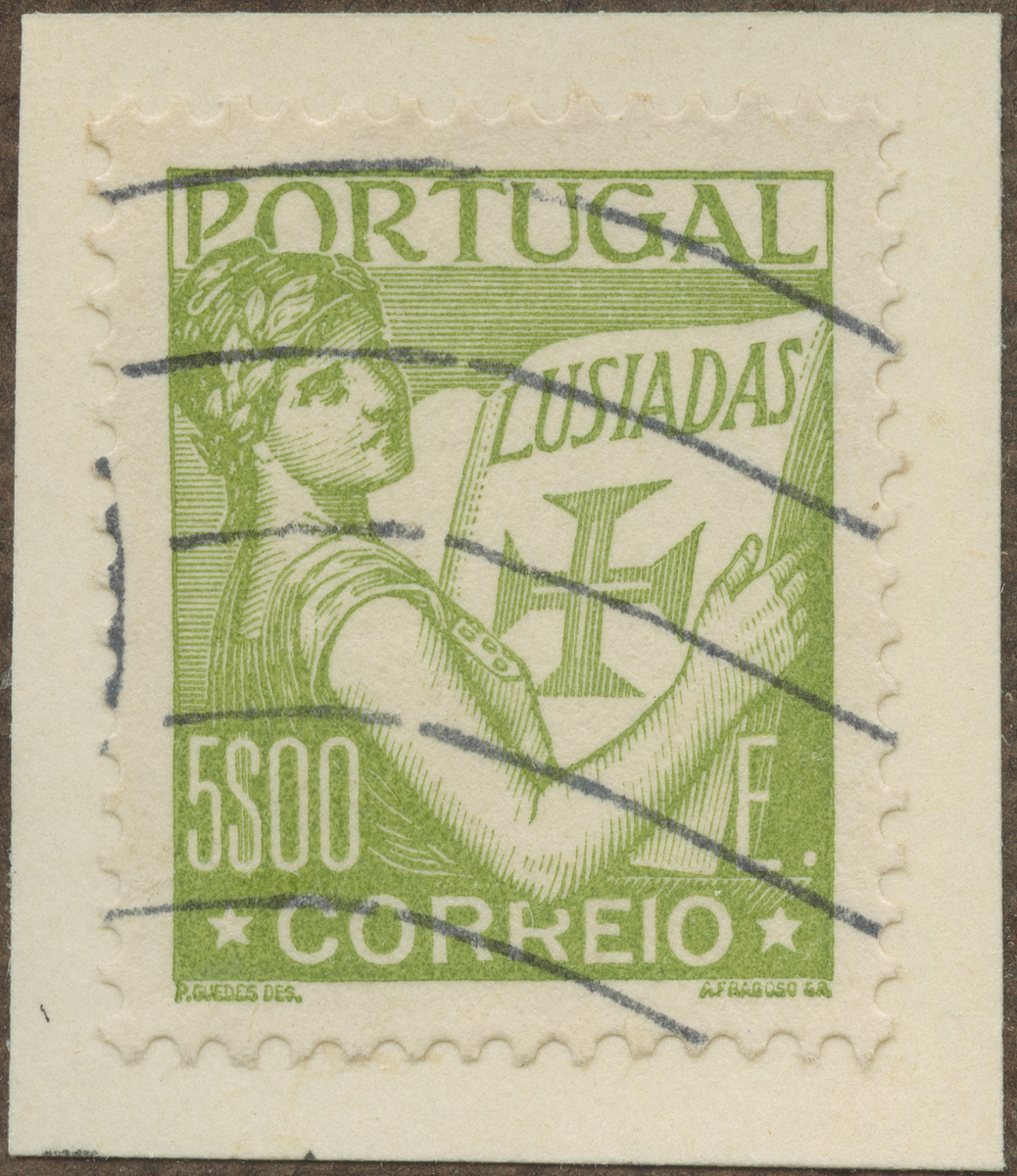Frimärke från Portugal, 1931. Motiv av (Diktaren Luis Camoes: 1524-1580) Allegori: "Portugal" med National Eposet "Lusiadas" av Luis Camoes som förhärligar Vasco da Gamas upptäcktsresor i Indien och Portugals storhetstid.