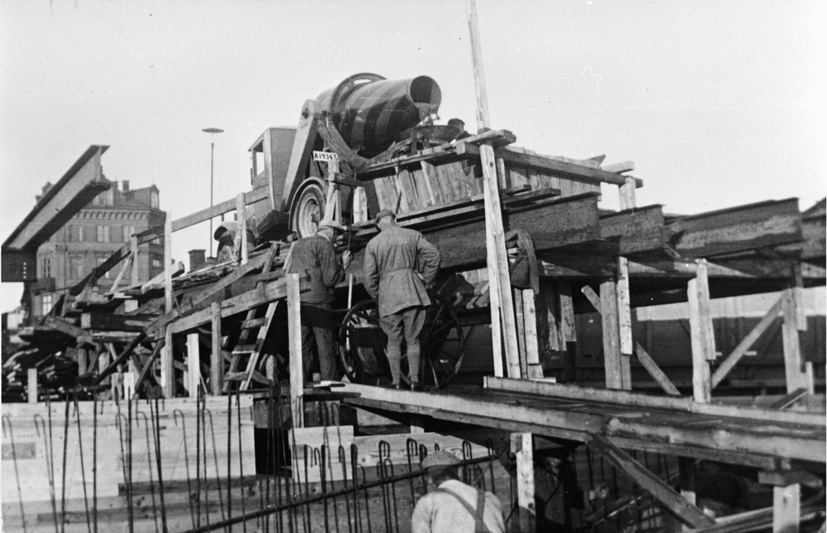 Byggherre: Byggnadsaktiebolaget Contractor, Stockholm. Dubbelviadukten vid Slussen. Betongbil-ficka-kärra, nedifrån.