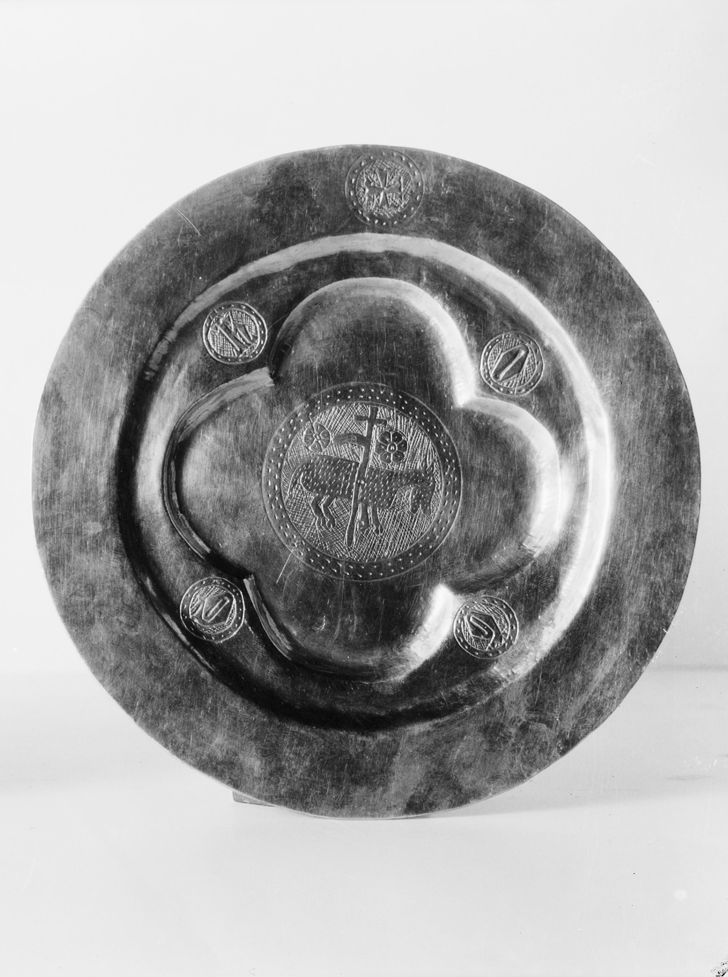 Patén, förgyllt silver, mittgravyr med Agnus Dei, 1300-talet.