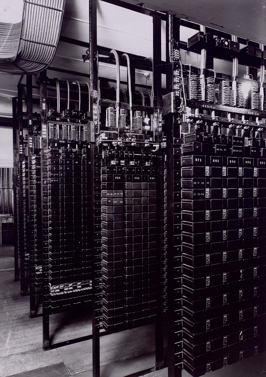 Slottsbacken 8. Gamla namnanropet. Snörrelästativ för ledningar från automatstationer