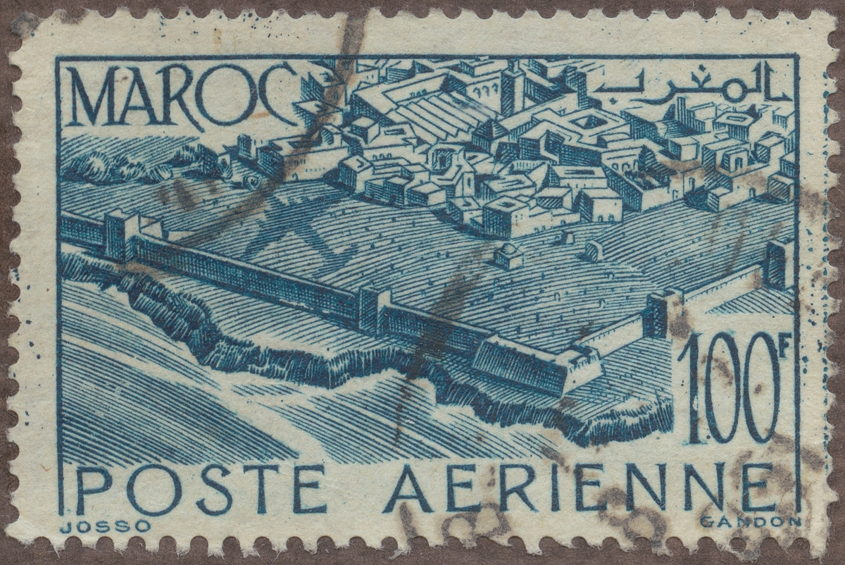 Frimärke från Franska Marocko, 1947. Motiv av 4-motorigt monoplan över muromgärdad stad: La Medina