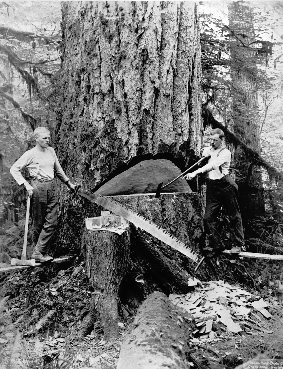 Svenska skogsarbetare i Västern. Douglasfuran ända till 8 fot i diameter.