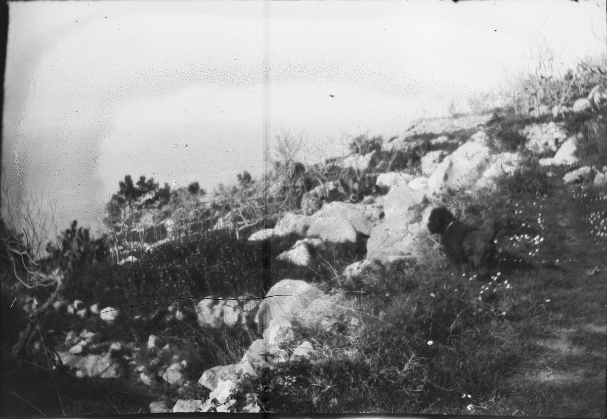 Drottning Victorias bilder. Hund blickar ut över äng.