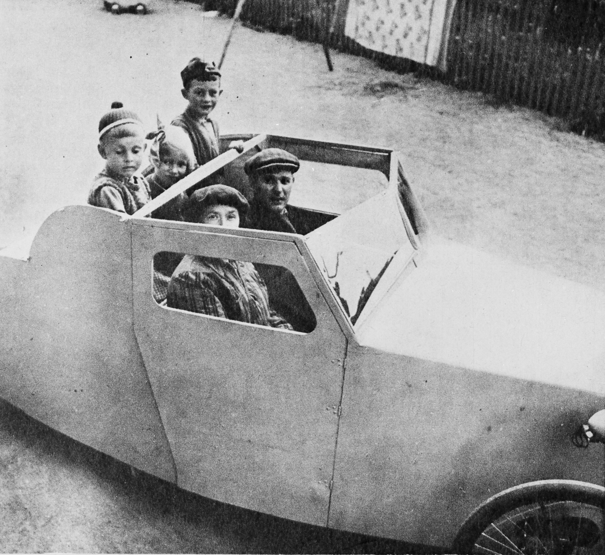 Järnvägaren Torsten Hansson i Linköping ute i staden på provtur med sitt nya semesteråk och med hela familjen "på släp". Cykelbil med två trampare.