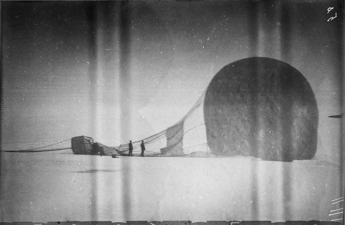 Titel: "Örnen" omedelbart efter landningen på isflaket den 14 juli 1897. Framtagning av bilderna gjordes av docent John Hertzberg år 1930 på Fotografi, Tekniska Högskolan.