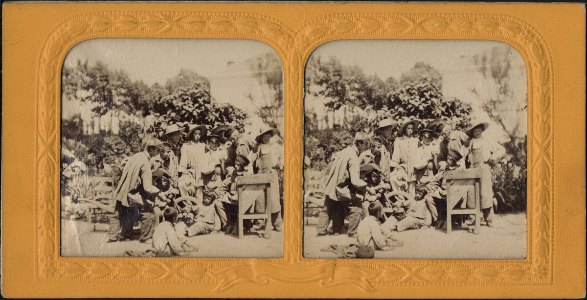 Stereobild av barn, sällskap vid skottkärra.