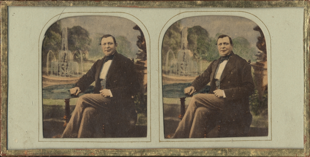 Stereobild, monterad och kolorerad. Porträtt av man.