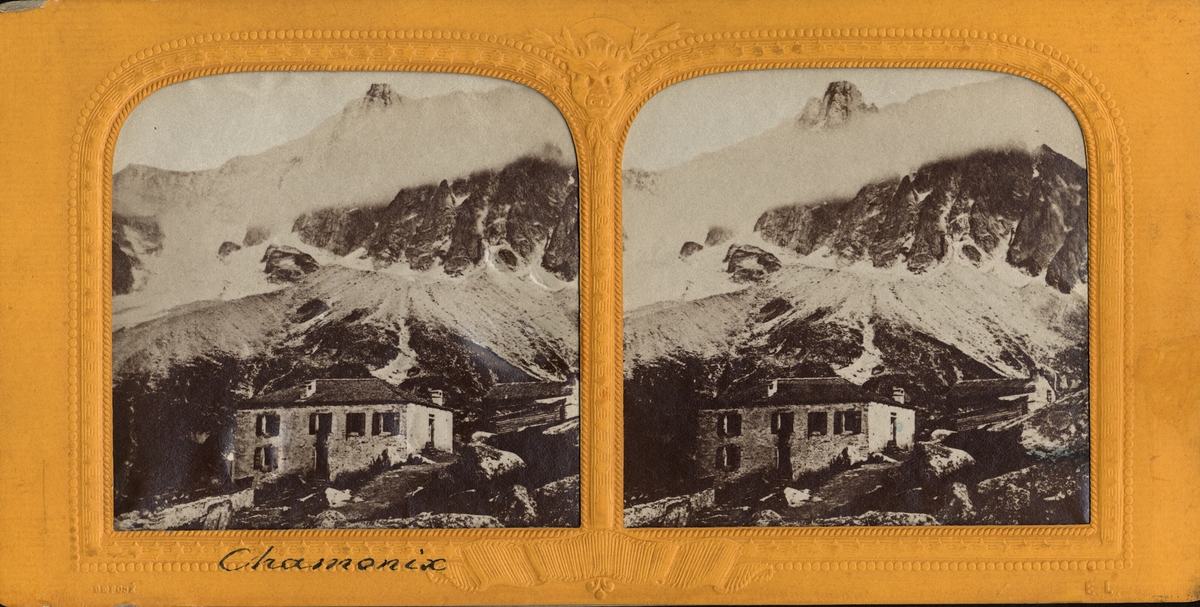 Stereobild av hus nedan snö och molntäckt berg i Charmonix.