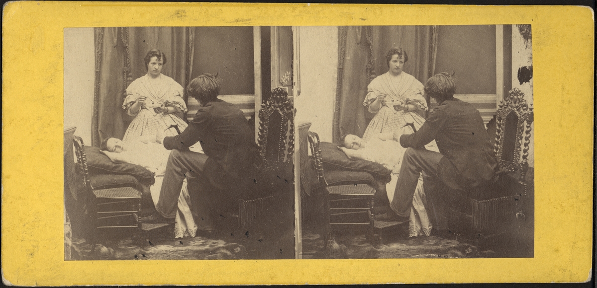 Stereobild av man och kvinna vid en tredje avsvimmad kvinnas säng.