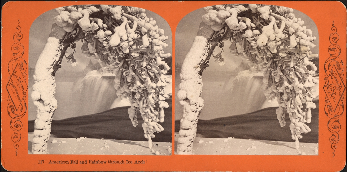 Stereobild av snötungt träd framför regnbåge över American Falls, Niagara Falls.