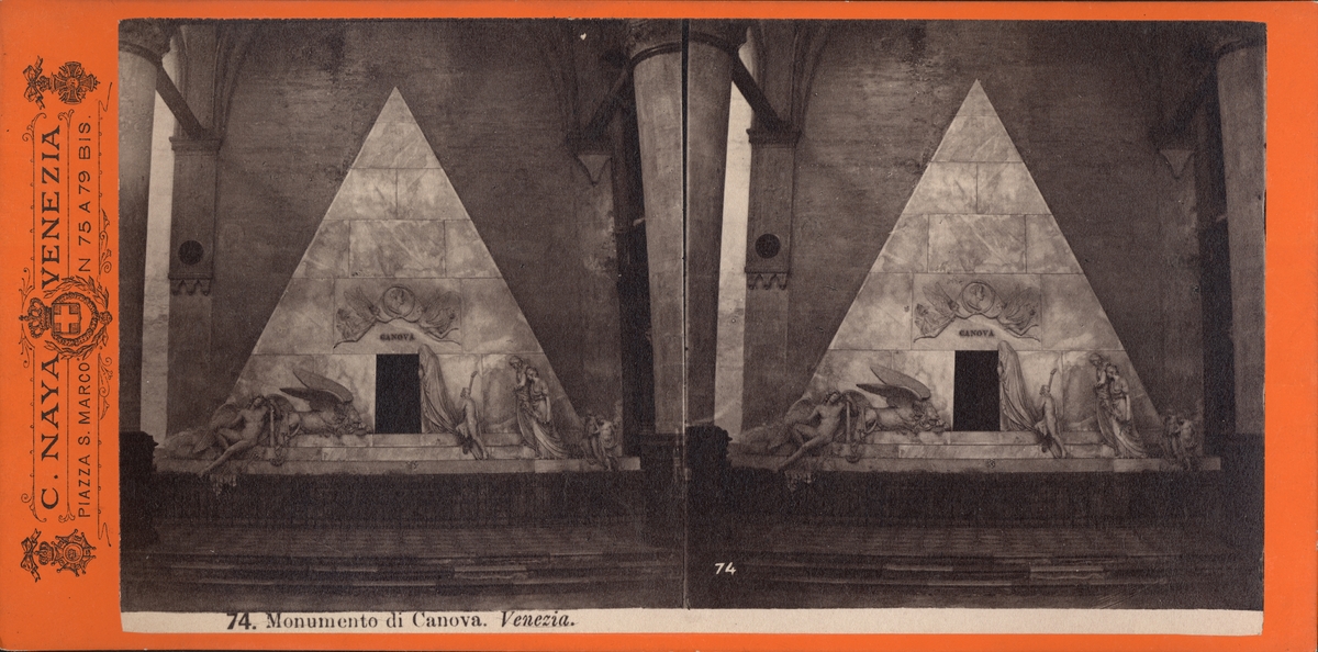 Stereobild av Monumend di Canova. Pyramidformad med änglar och andra skulpturer framför.