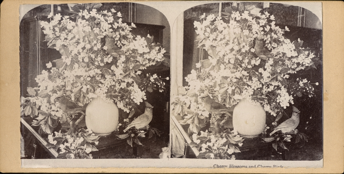 Stereobild av vas med körsbärsblommor och fåglar (Cherrybirds).