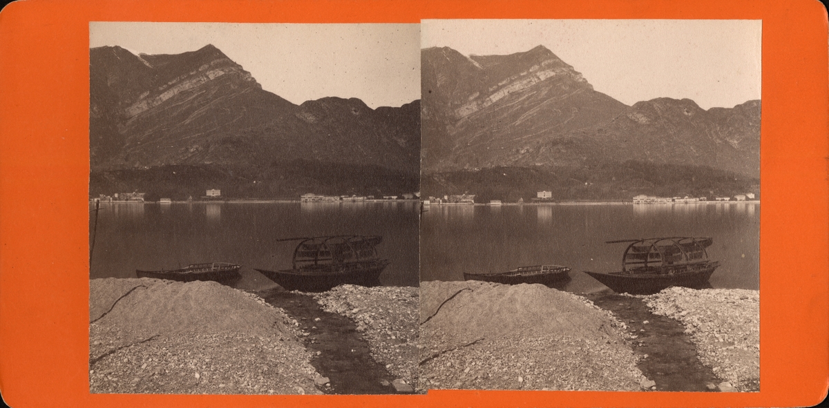 Stereobild av två båtar på sjö med berg i bakgrunden i Cadenabbia.