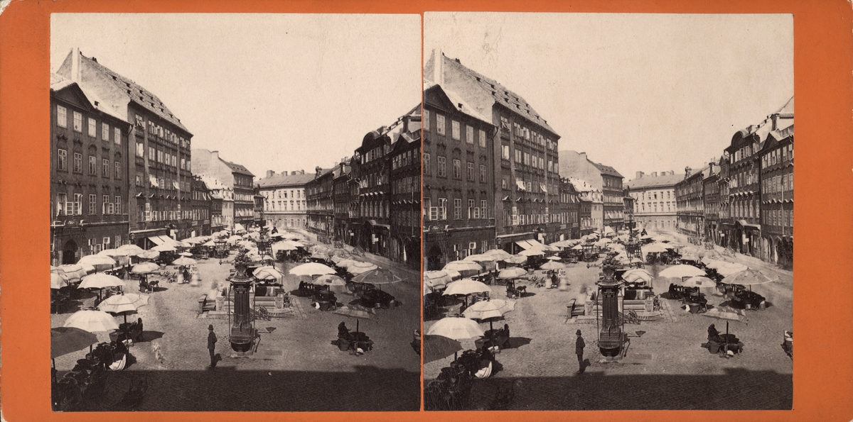 Stereobild av obstmarkt (fruktmarknad) i Prag.