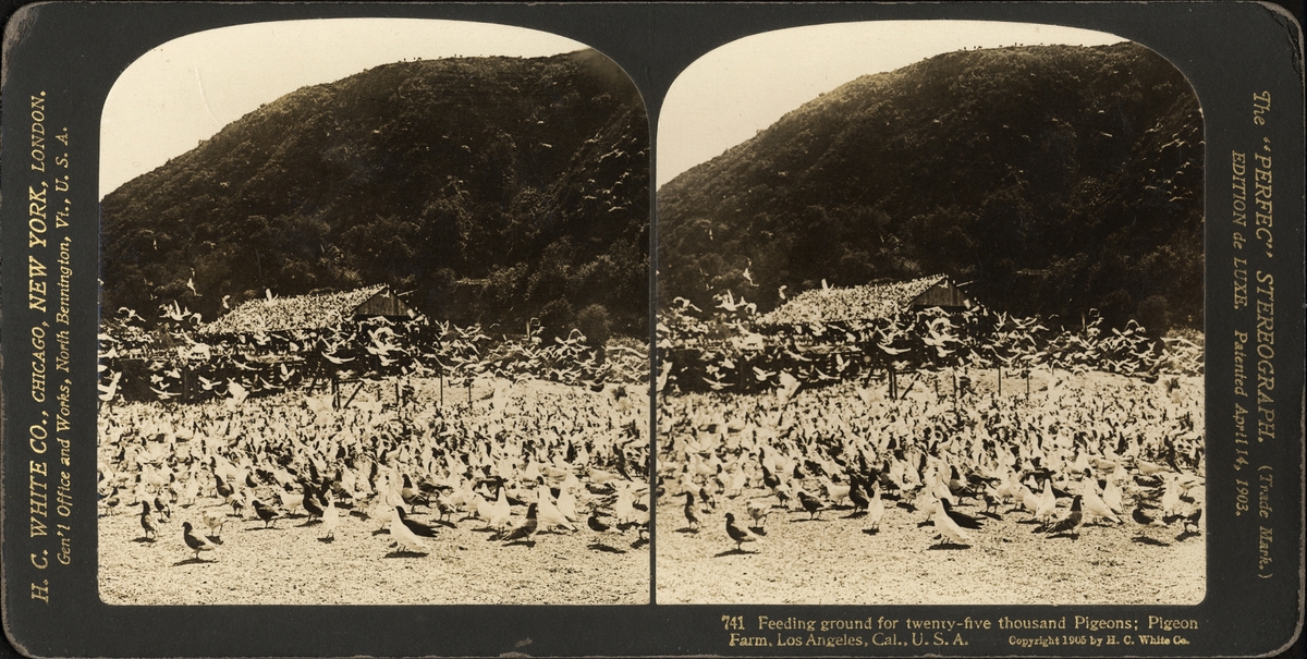 Stereobild av matplats för 25 000 duvor vid duvfarm.