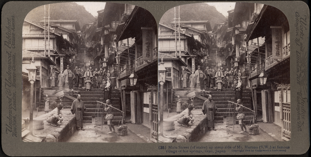 Stereobild av huvudgatan, trapporna i Mt. Haruna, de varma källornas stad, Ikao, Japan.