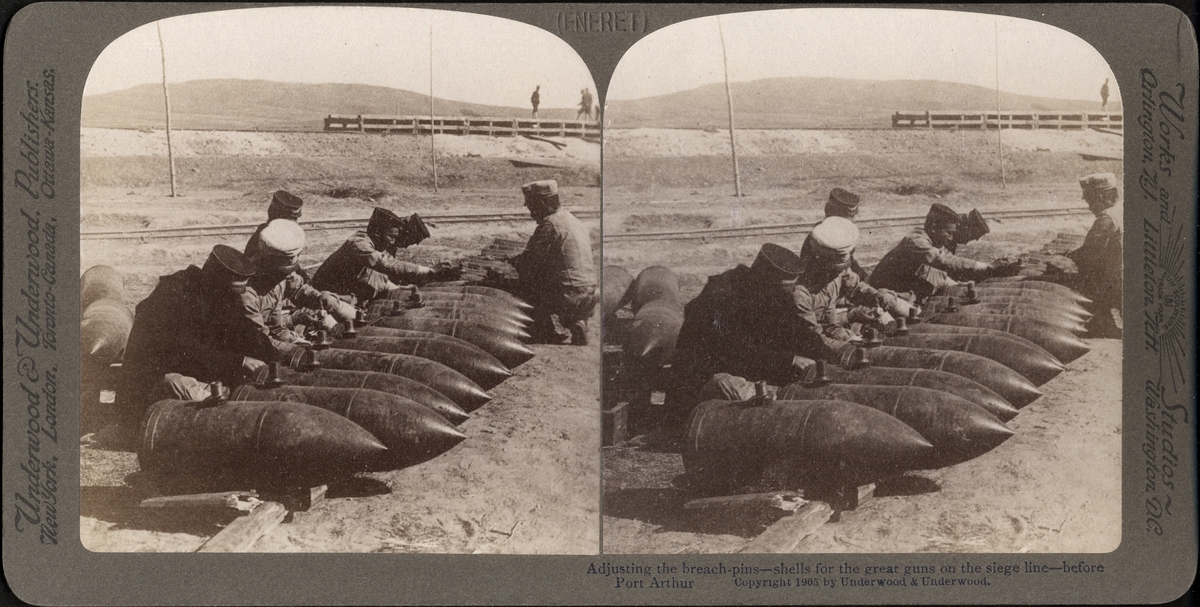 Stereobild av män som justerar bomber vid belägringen, Port Arthur (senare Lüshunkou).
