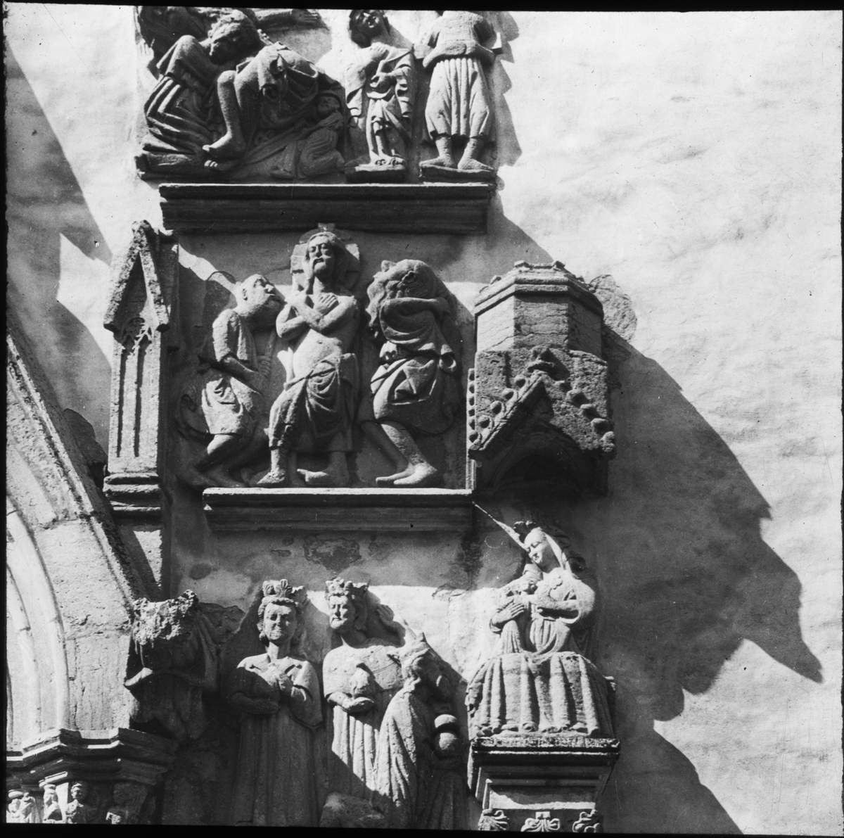 Ljusbild, fotografi från Nordiska arkitekturmötet på Gotland 1920. Skulpturer på kyrkovägg.