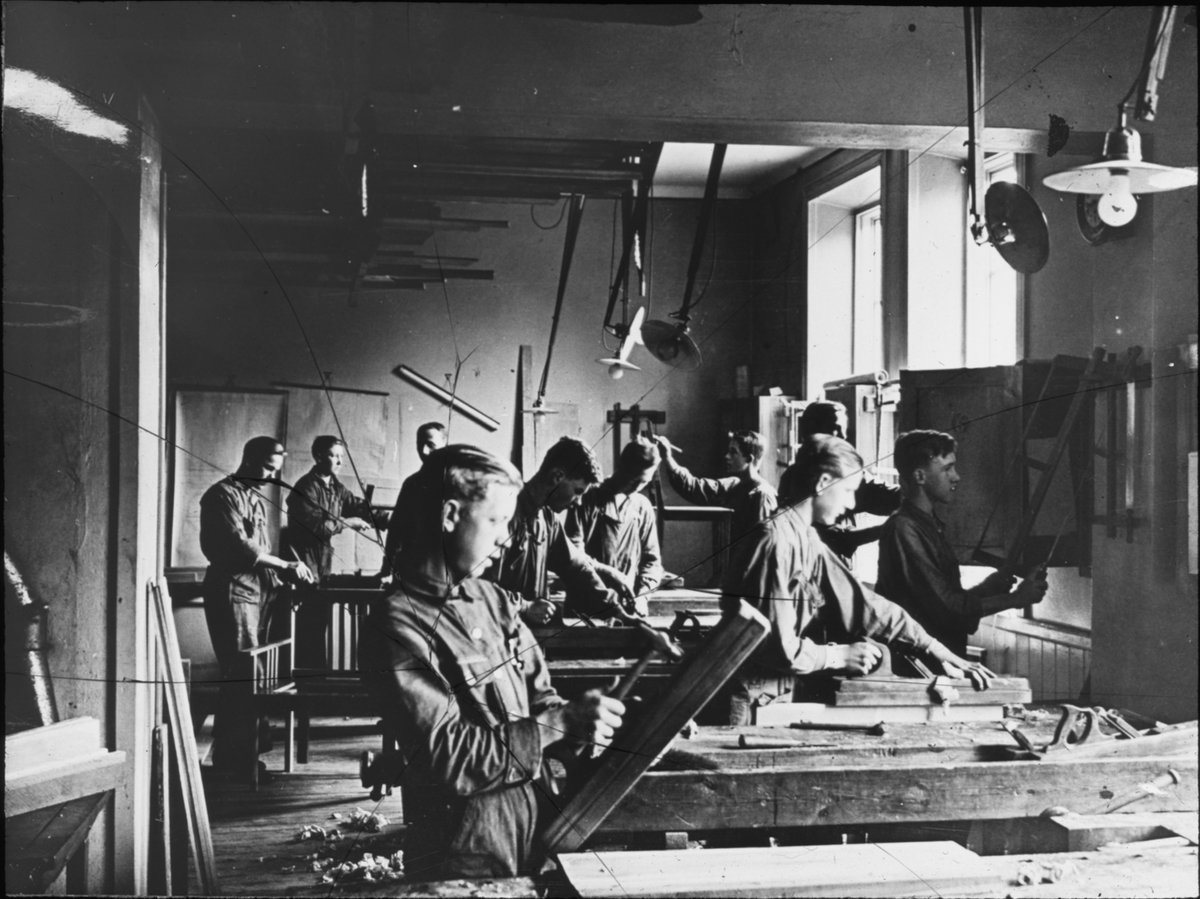 Ljusbild, fotografi innfrån verkstad/snickeri. Yrkeskola.