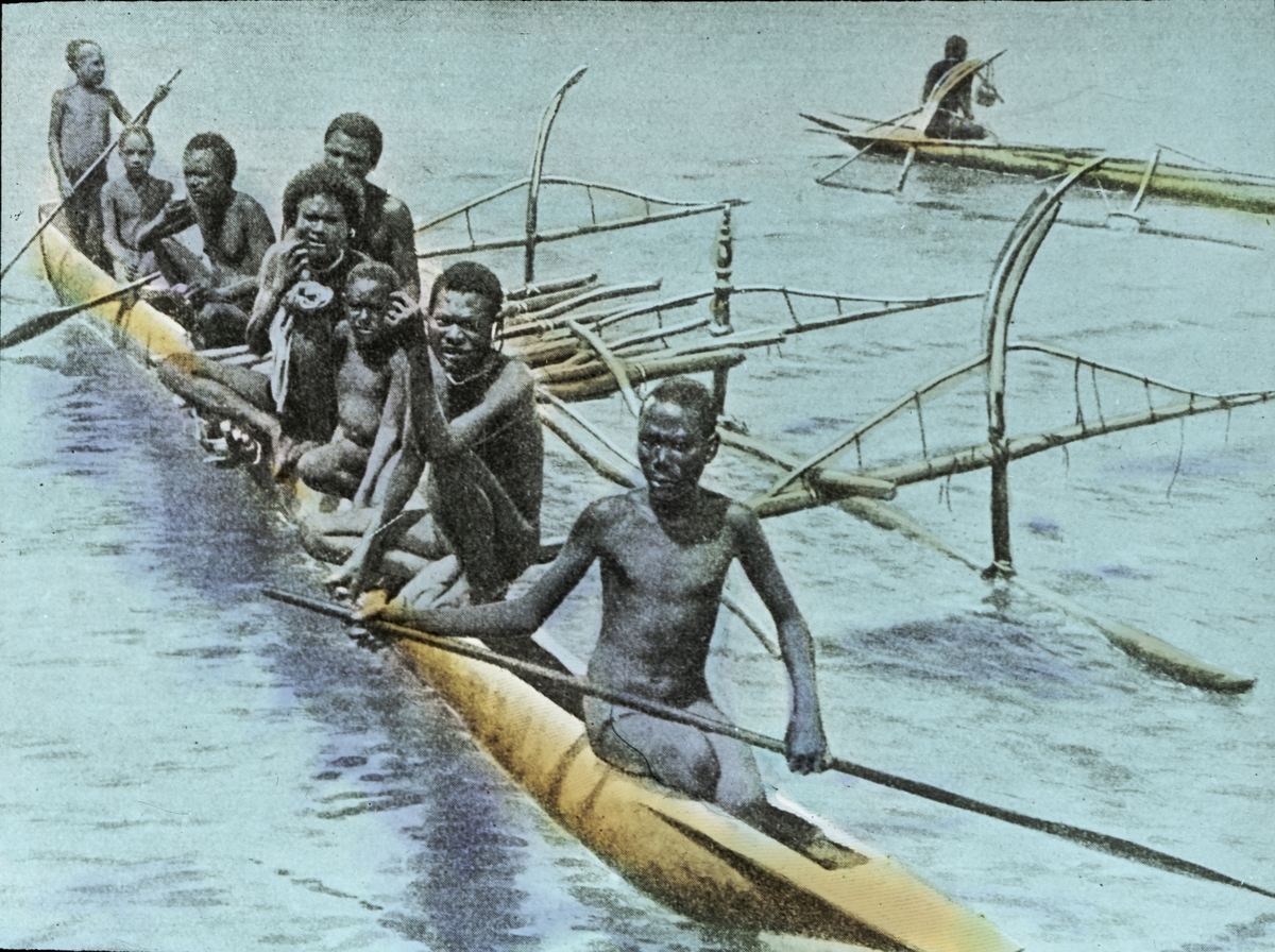 Kolorerad ljusbild med motiv av urbefolkning i kanot.